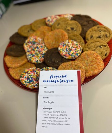 At The Argyle we love cookies. We are giving a big thank you to the wonderful and supportive family for donating these DELICIOUS cookies for our hard working staff. We appreciate your thinking of us!